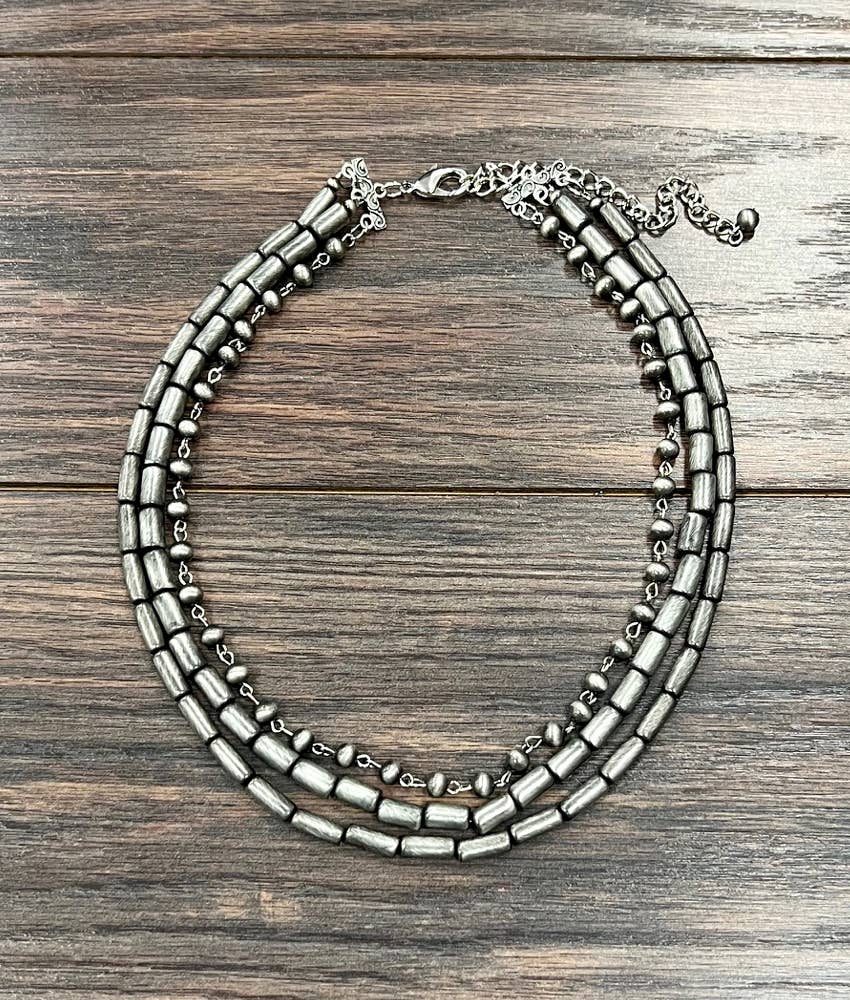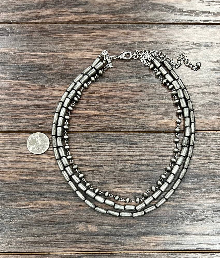 18" to 23" Long, Handmade 3-strand Navajo Bead Necklace * 3-strand (16", 17", 18" long) necklace & 5" extender * 16" long, tiny 4mm navajo bead interlocked necklace * 17" long, 5mmx12mm cylindrical navajo bead necklace * 18" long, 6mmx10mm cylindrical navajo bead necklace * 35 grams weight * Nickel, Lead & Chrome free