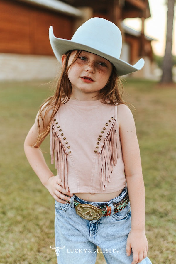 Girls' western fringe top in soft blush pink with sleeveless design and antique stud trim. Perfect for rodeos, western events, or everyday wear. Lightweight fabric moves with her while keeping its shape. Pair with denim or skirts for an instant western vibe.